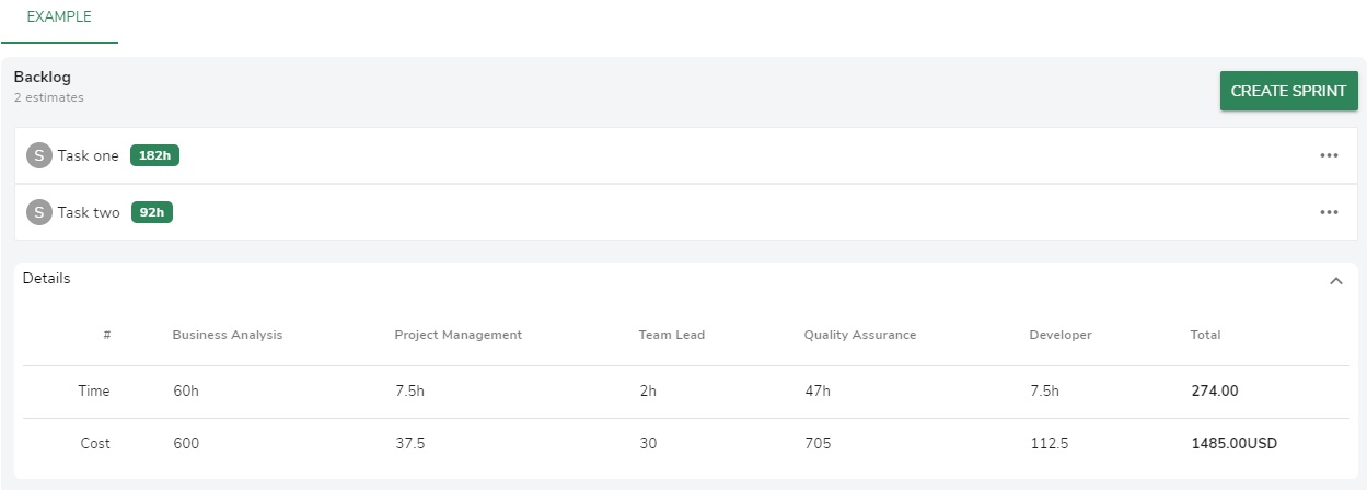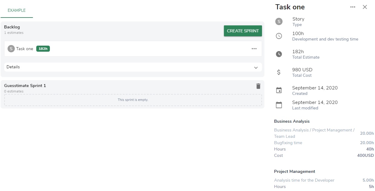Guesstimate uses complex calculations based on user's development time, preferences and payment settings and shows the total amount of hours and money required for the task as well as detailed information about each individual criterion.